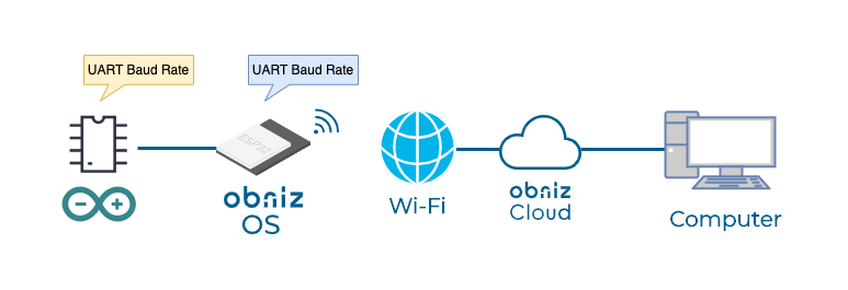 Serial.begin(115200);written on the Arduino side is a yellow balloon BaudRate, thevar baud = 115200` written on the obniz side is a blue BaudRate.