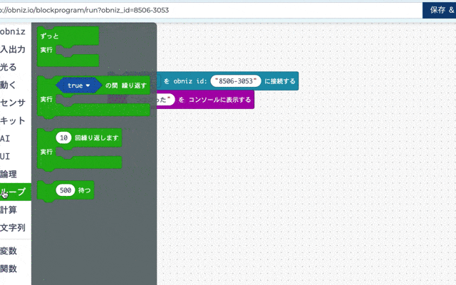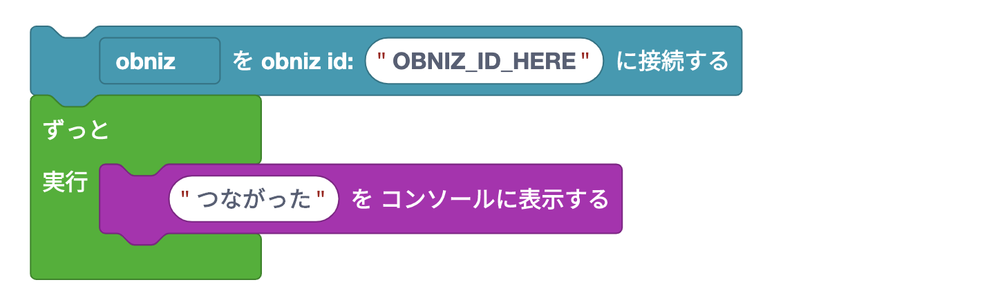 I'm going to put this in after connecting it to obniz, and then I'm going to put something that displays text on the console in it.