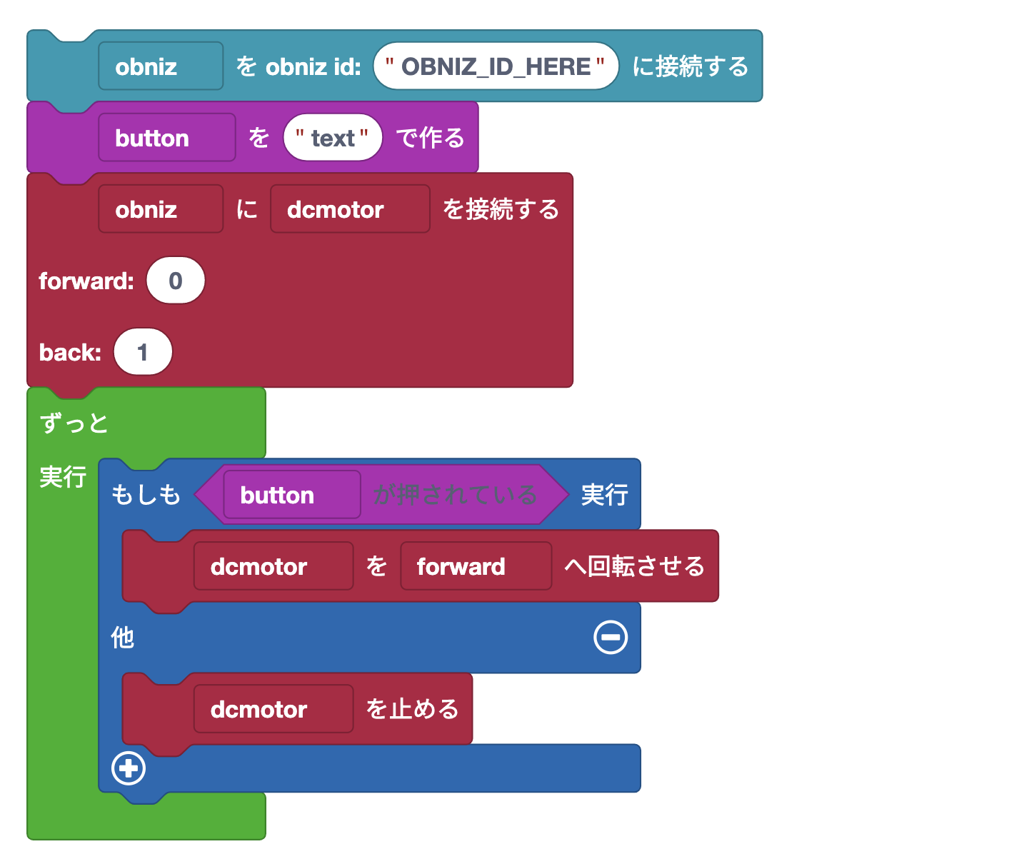 var obniz, button, dcmotor;