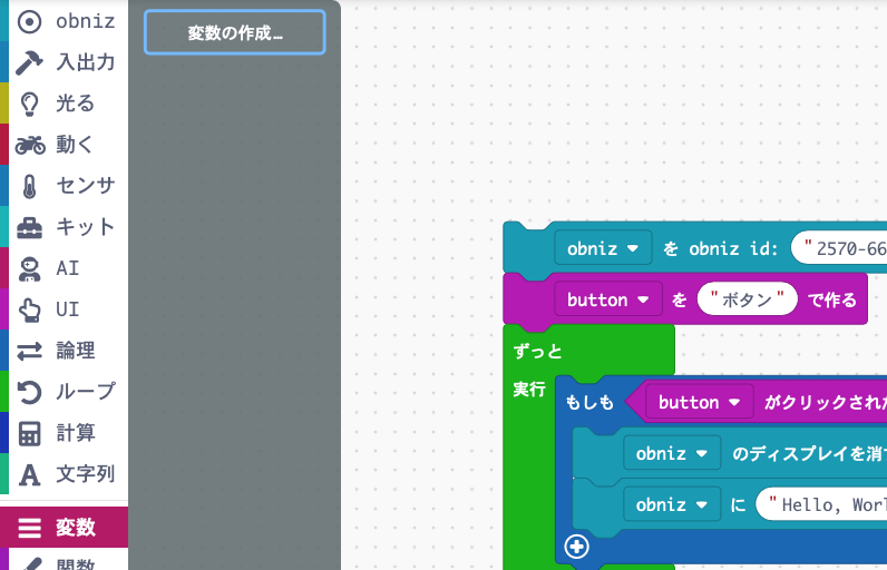 The block program of obniz is based on a language called JavaScript, so you can use the variables of JavaScript.