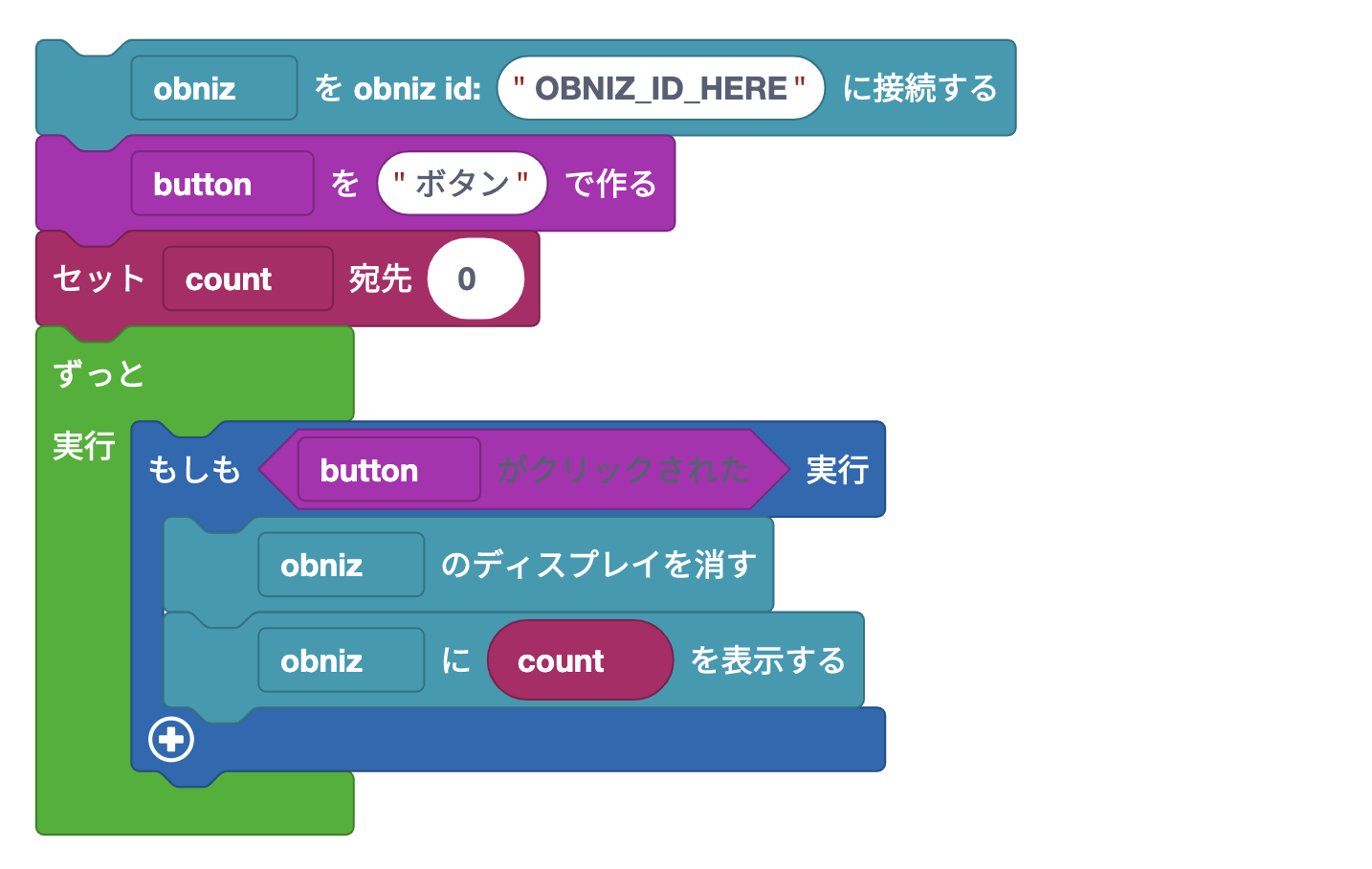 The count is 0+1 with a 1 in it. Then the obniz display will show the value in the count, which is 1