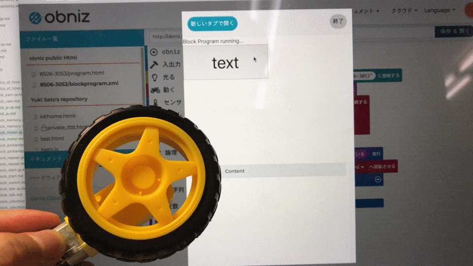 If the button is pressed, the "rotate dcmotor to forward" block will be executed, so the command to turn the motor will reach obniz and the motor will turn.