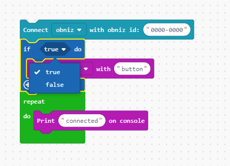 I keep putting the "if" in the execution. Then, put the "Turn off display" and "Show Hello World" blocks in "obniz" into the "What if" block newly.