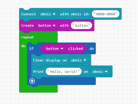 Let's press the button on the screen. Press the button and you should see "Hello World" on the obniz display.
