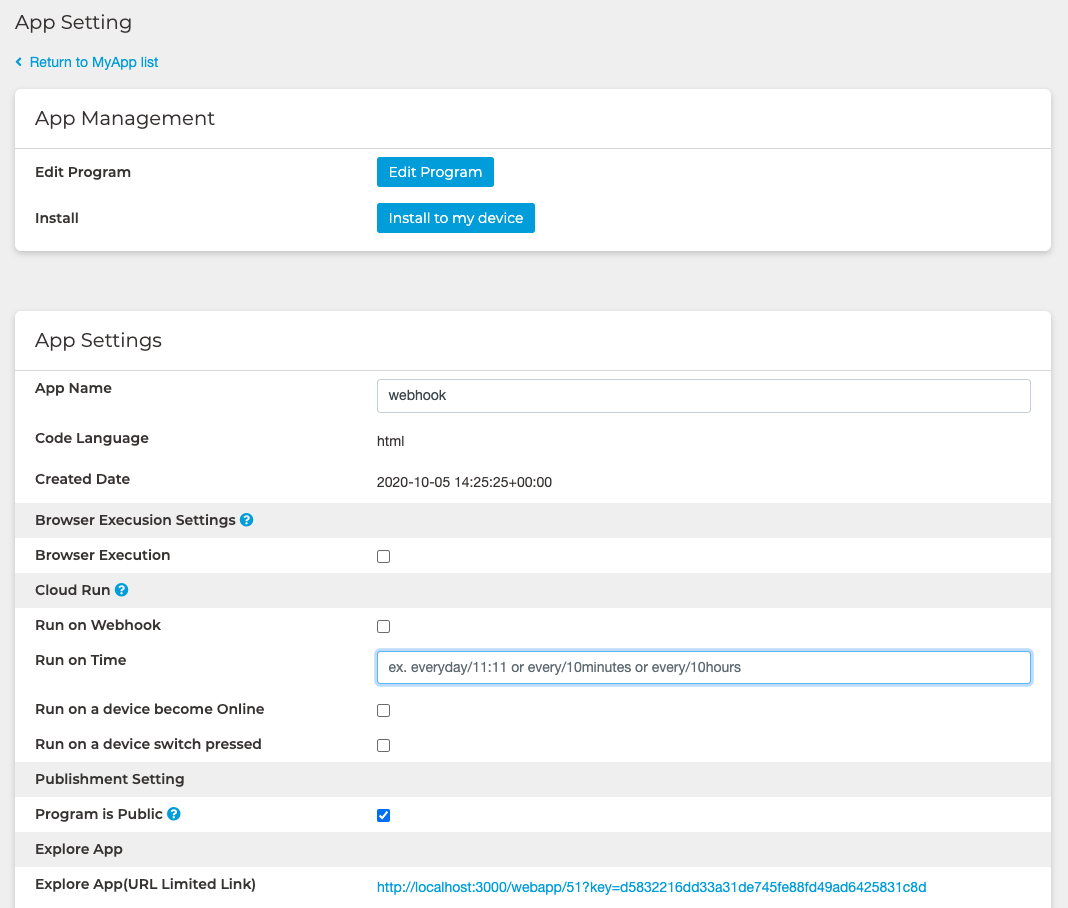 Here you can set up your app, such as the name of the app, the trigger for running the cloud, and more.