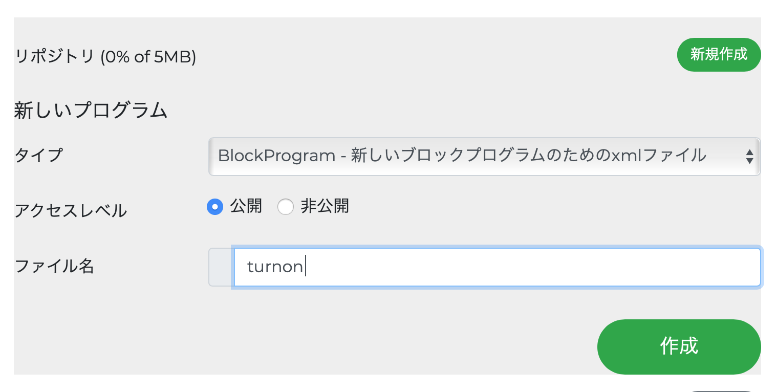 For the process of creating an account on the cloud and registering obniz, see [About Account] (/obniz_cloud/about_cloud_account).Based on that, we will create an account and link the obniz you have to the account.When that is completed, select "block program" as the type from the new repository creation from [Developer Console] (https://console.obniz.com), give an appropriate file name (this time, "turn on"), and create a program file. ..