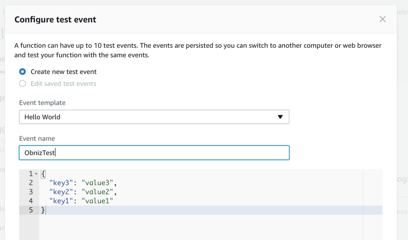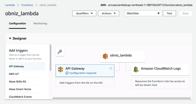 Be careful not to compress the whole folder by mistake. (index.js comes to a lower level, such as obniz_lambda/index.js, and is used in (I'll be done.)