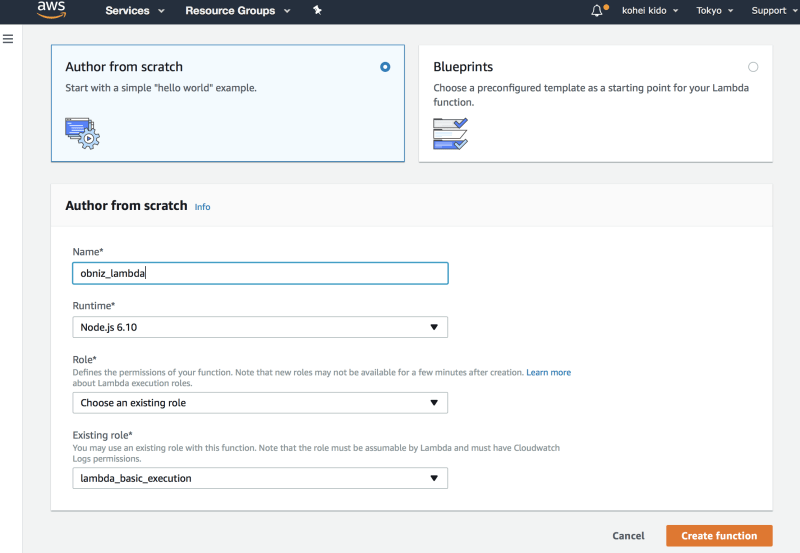 Set the code entry type to "Upload a .ZIP file" and add "obniz_" to the Upload the "lambda_codes.zip" file.