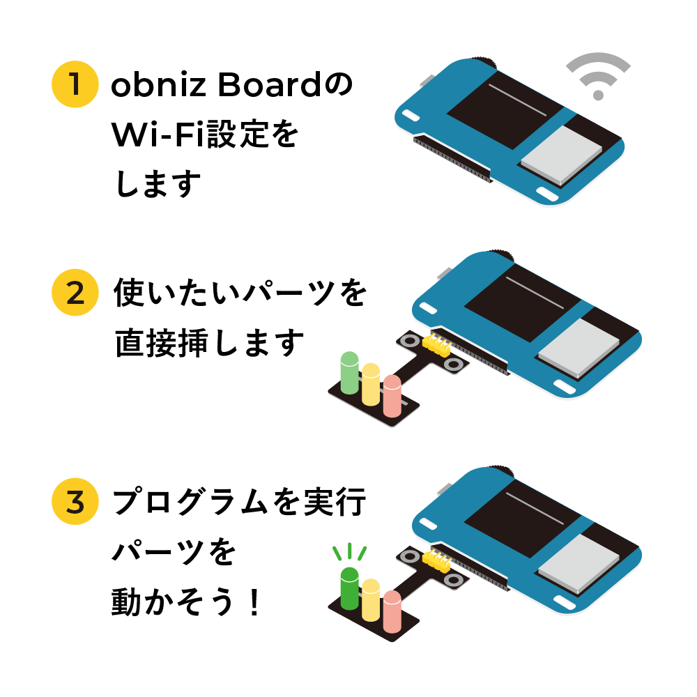 First, connect the obniz Board to Wi-Fi.TO setup procedure, please refer to Start obniz Board and set up Wi-Fi..