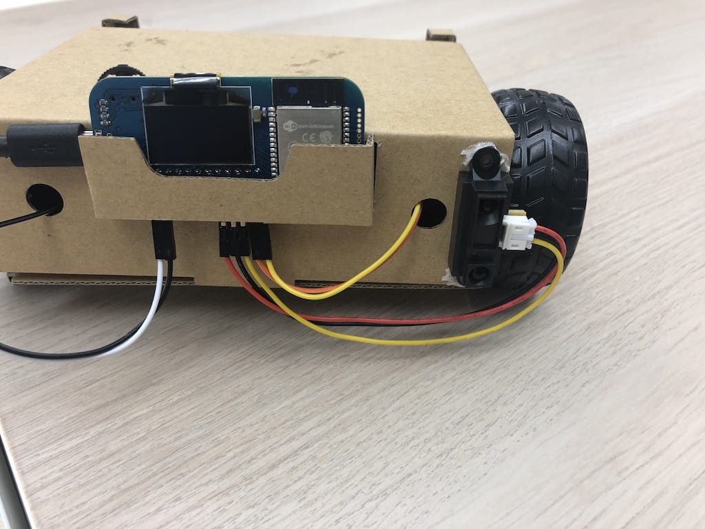 両面テープを距離センサーにつけて、ボディーに設置します。例えばこのように。