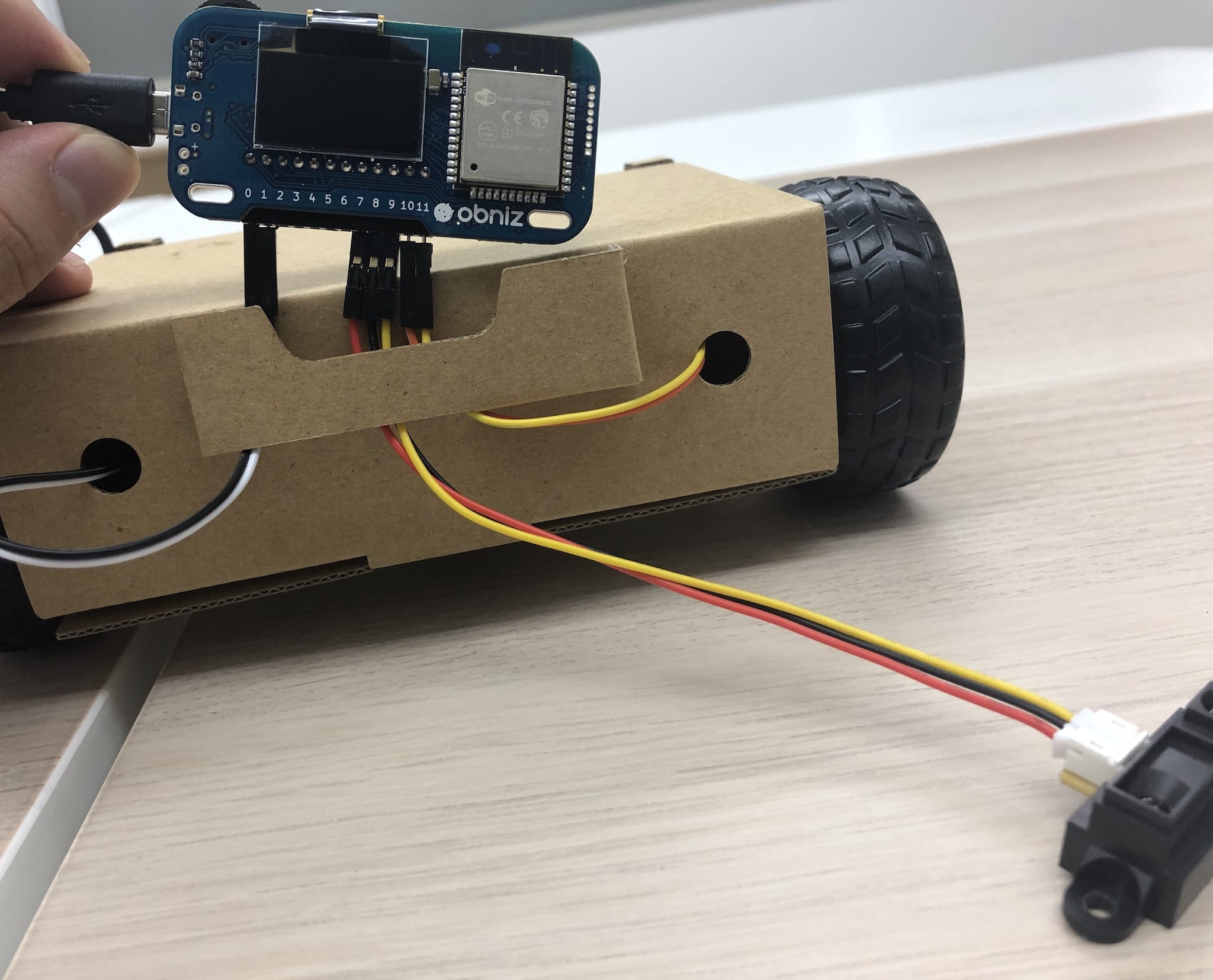 下の写真のようにobnizの7番に赤、8番に黒、9番に黄色を接続します。