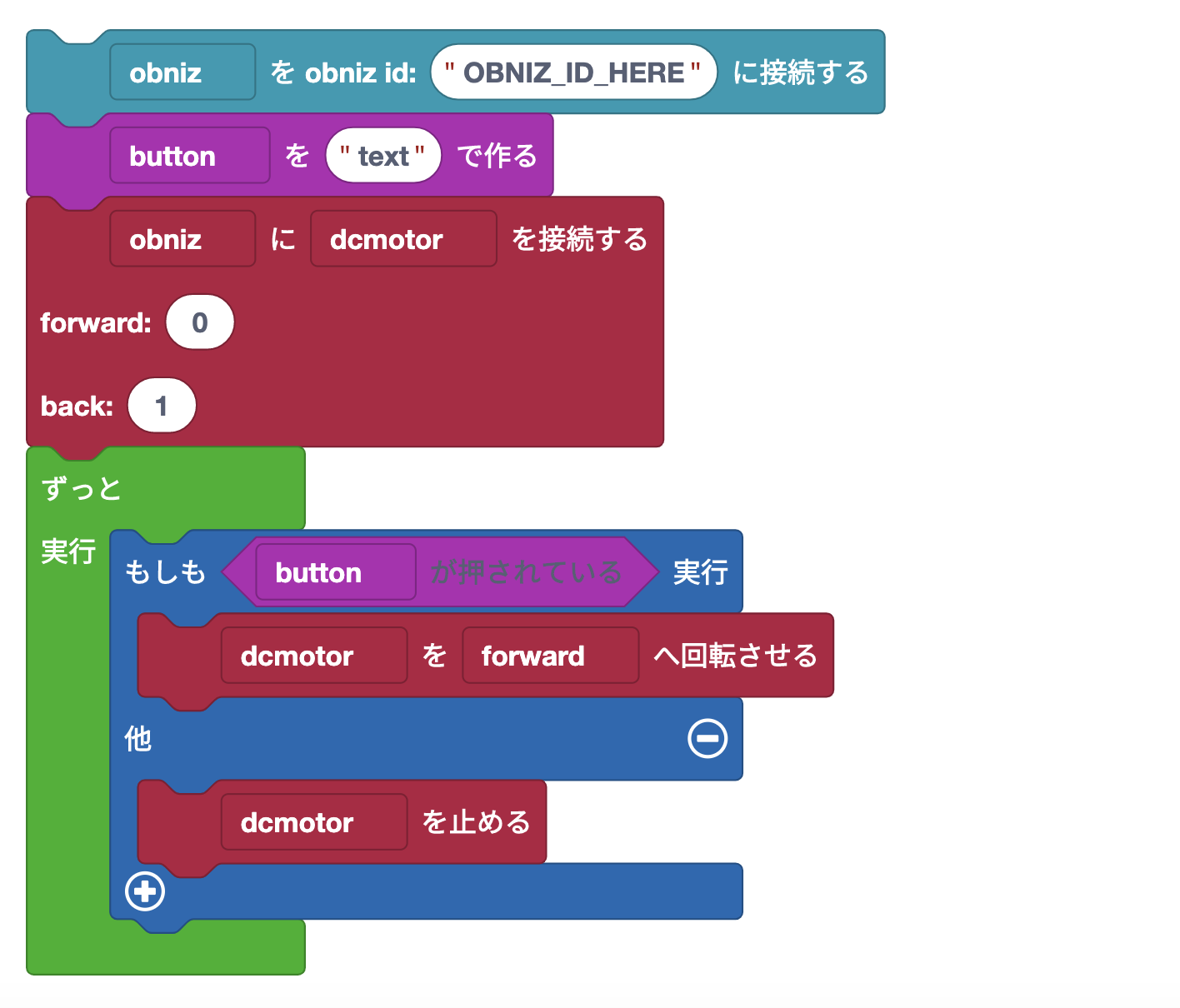var obniz, button, dcmotor;