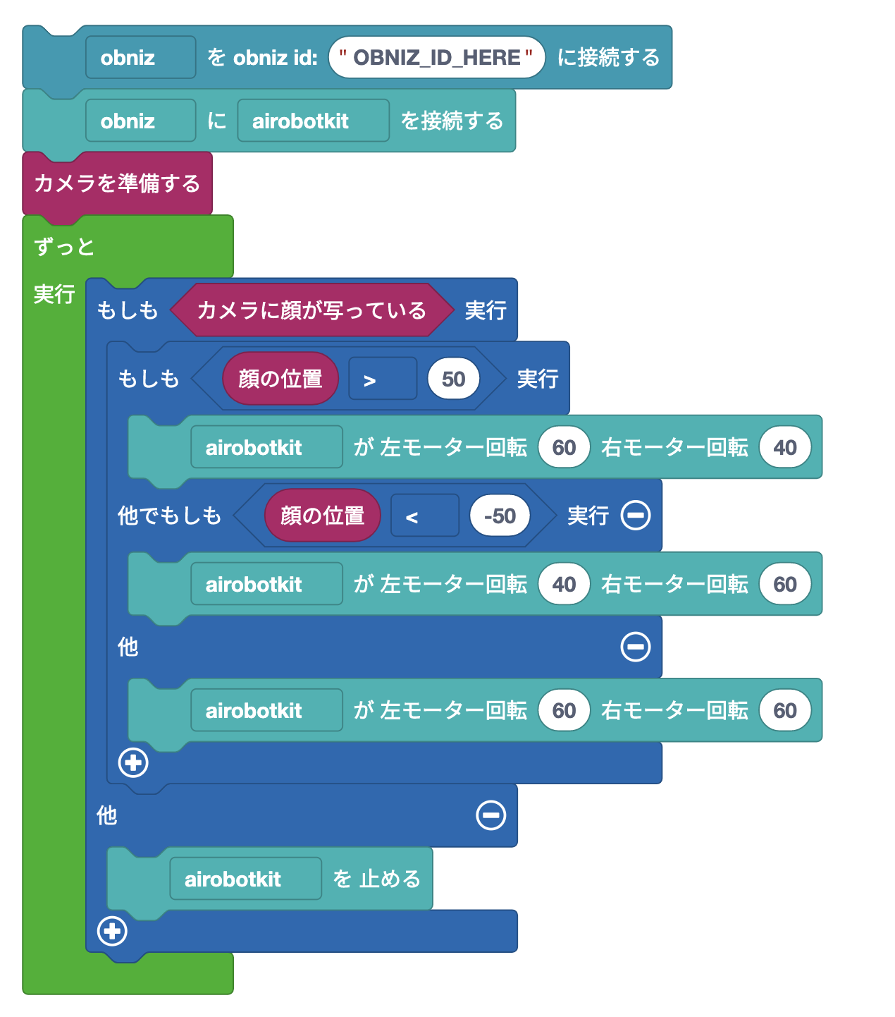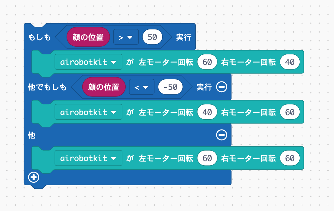 これを使って、顔が右の方にあるときは右モーターを少し弱くして右に進めて、左のときは左を弱めてみましょう。
