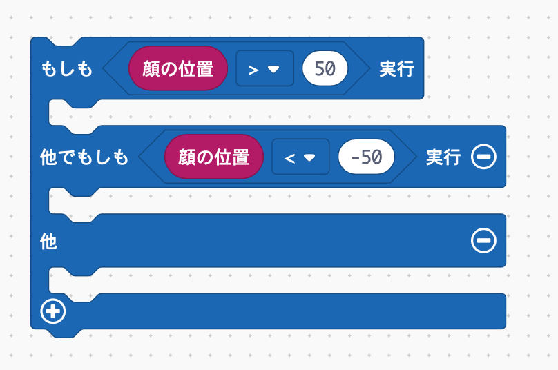 もしもブロックの左下にあるプラスを押して条件を増やし、今度は-50より小さかったら という条件にします。そして、どちらでもない「他」も用意します。他ということは、顔が-50から50のだいたい真ん中にあるということです。