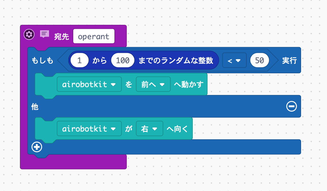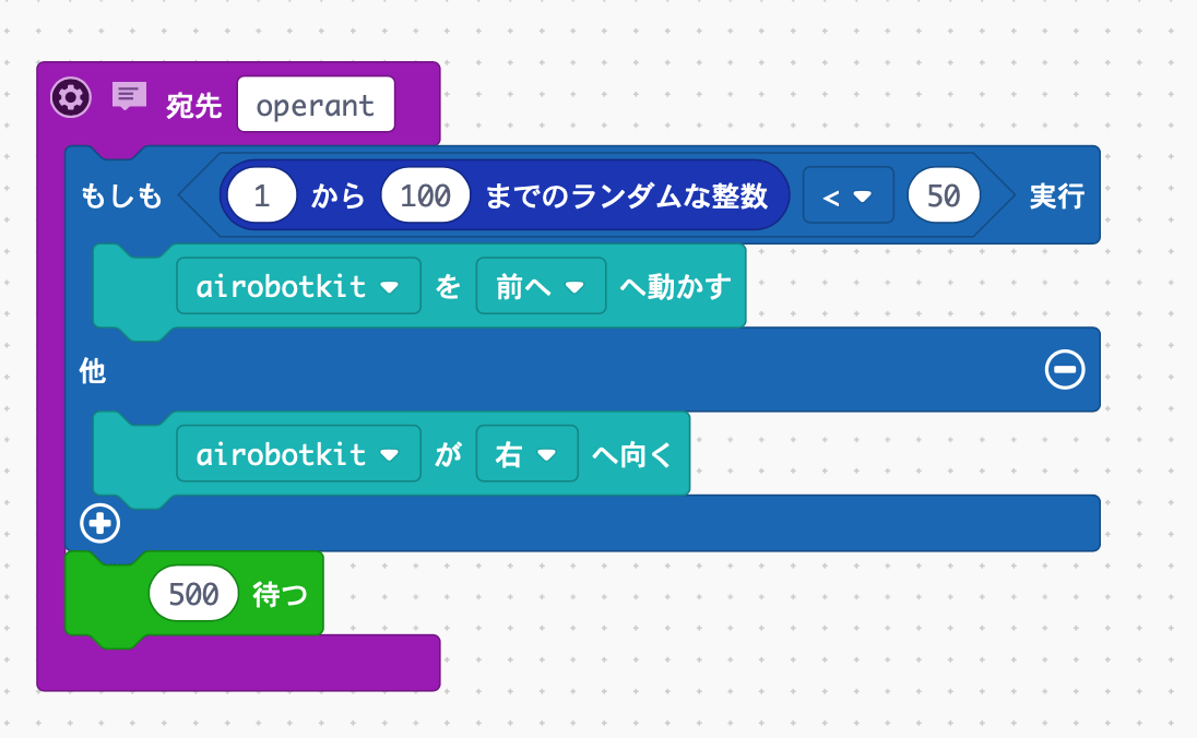 この数字が”偶然”50より小さかったらロボットは前へ、そうじゃなかったら右回転するようなプログラムです。