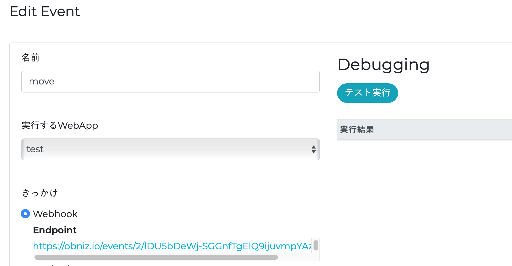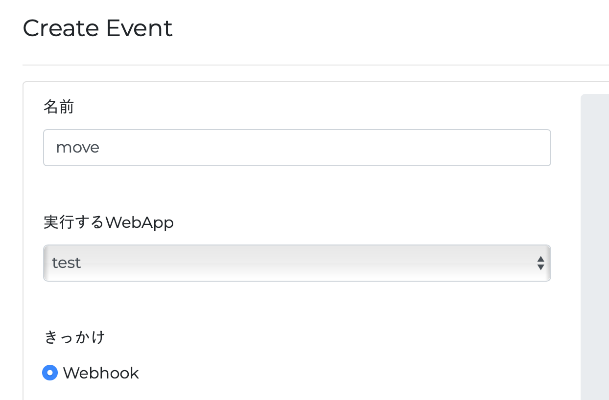 名前はmoveにしました。そして、実行するWebAppは先ほど作成したものを選びます。今回は"test"というのにしましたので、それを選んでいます。きっかけは Webhook です。