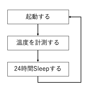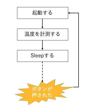 この何もすることがない時間でSleepすることで、電池消費を少なくすることができます。そして、時間がたったら自動的に起動して、再度温度を計測することができます。