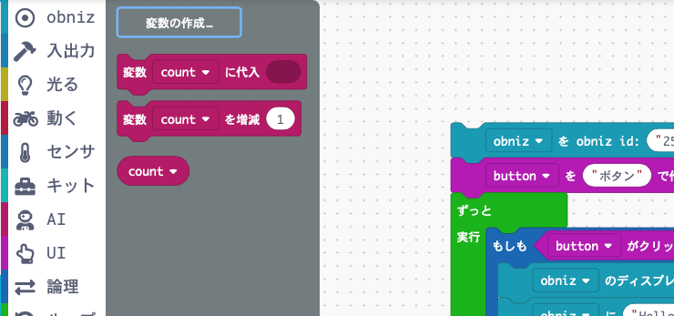obnizのブロックプログラムはJavaScriptという言語をベースにしているので、JavaScriptの変数を使うことができます。
