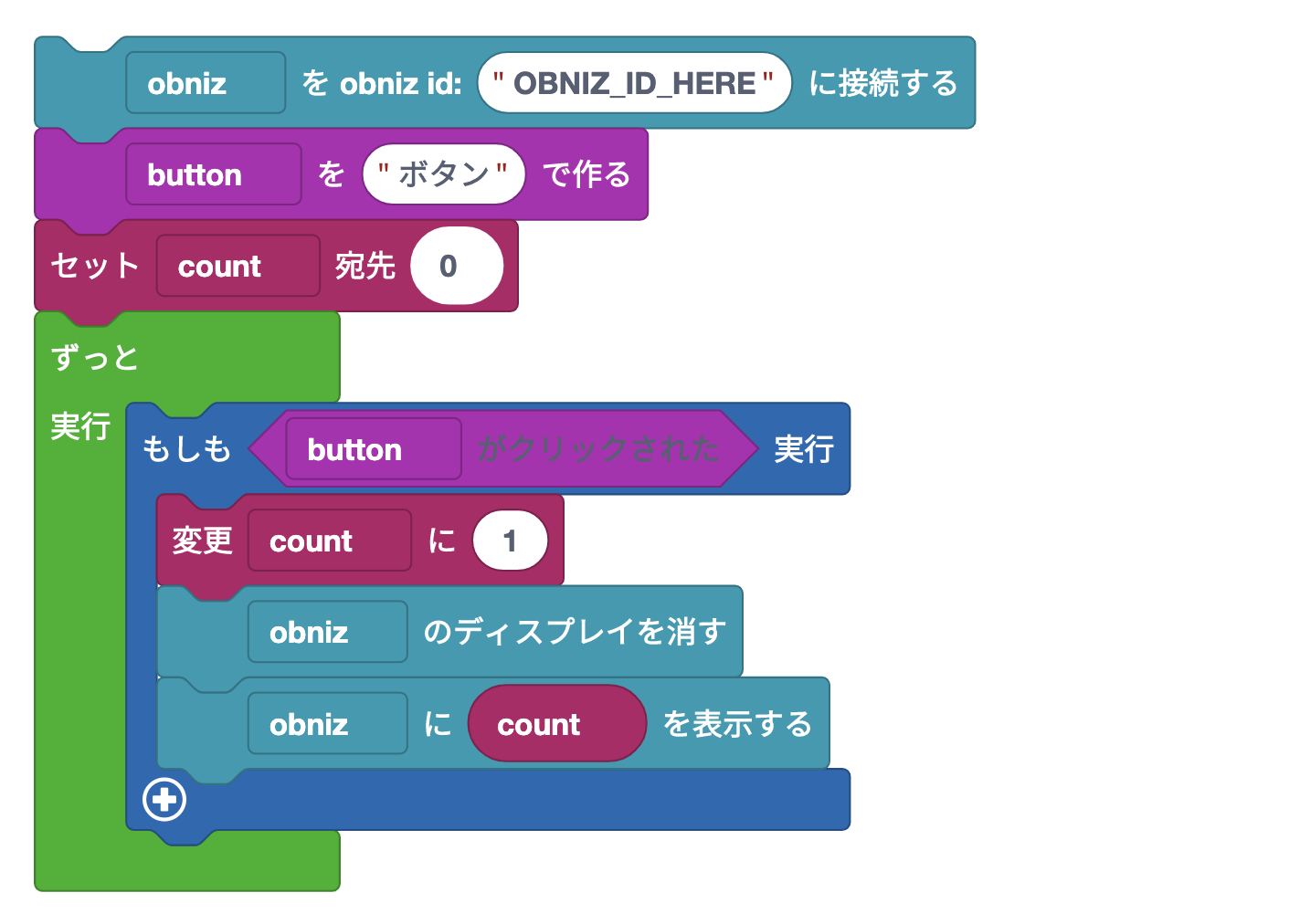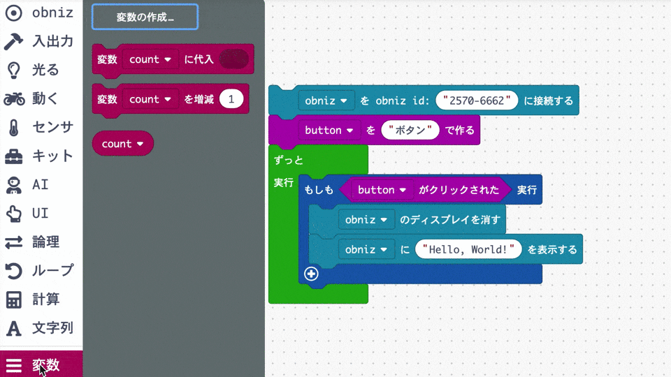 変数ブロックにある丸いcountブロックをつかんで「obnizに Hello Worldを表示する」となっているそのHello Worldのところに置いてみましょう。