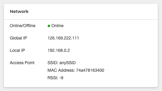 | Access Point | デバイスがWi-Fiでネットワークに接続しているときのWi-Fi情報です。SSIDやMAC Address、それに初回接続時の電波強度(RSSI)を確認できます |