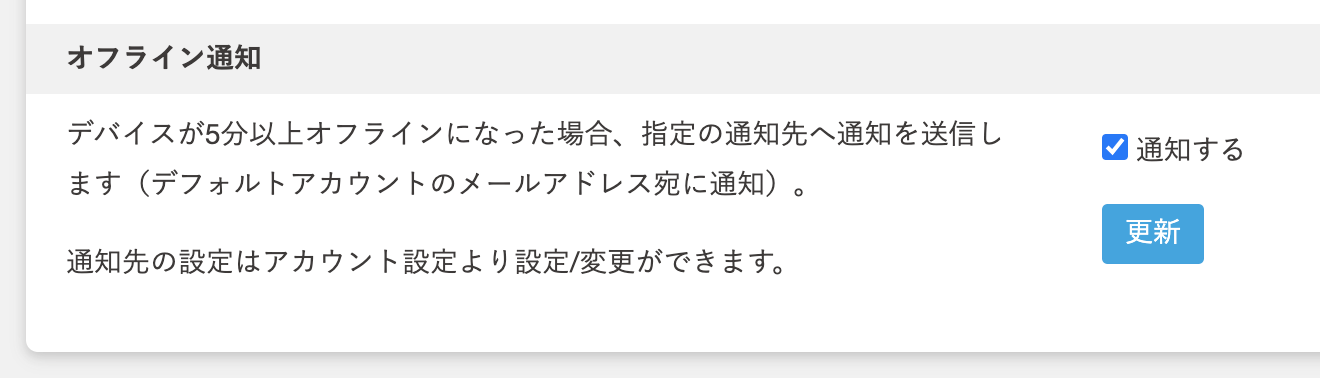 端末がオフラインになった際に、メールなどでお知らせする機能です。この機能を利用するかどうかをデバイスごとに設定できます。