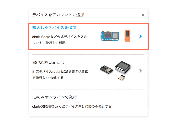 登録したい公式デバイスの電源が入っていて、Wi-Fiにも繋がっていることを確認してください。ディスプレイに8桁の数字(obnizID)が表示されていたらデバイスの準備はできています。