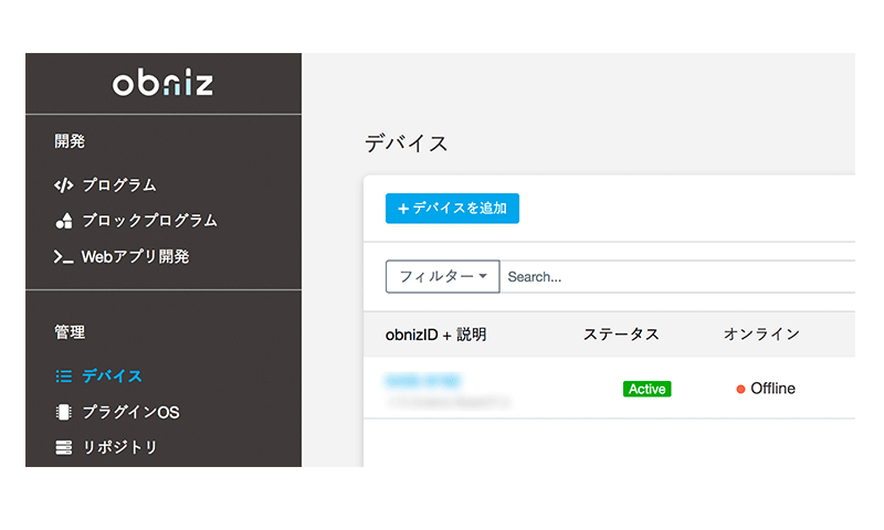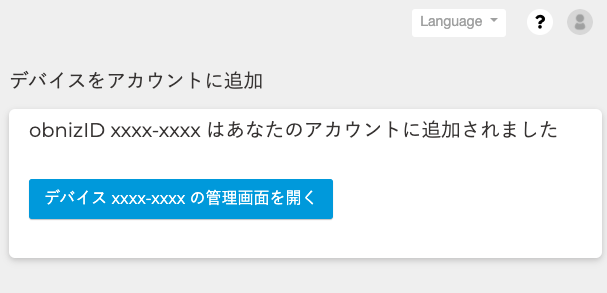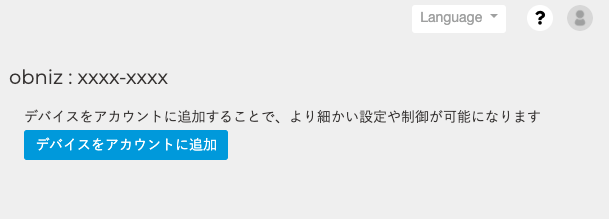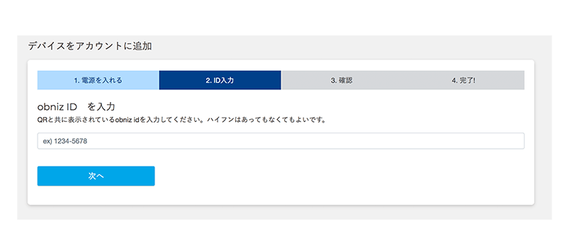 obnizIDを半角英数で入力します(デバイスのディスプレイに表示されている8桁の数字がobnizIDです)。ハイフン(-)はあってもなくても良いです。