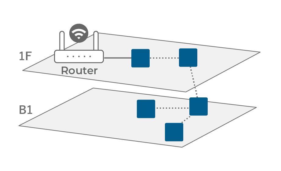 Wi-Fi MESHによりobnizのデバイス同士がWi-Fiで自動的にネットワークを構築。最もWi-Fiルーター(アクセスポイント)に近いデバイスのみがWi-Fiに接続し、それ以外はネットワーク経由でクラウド接続を行う機能です。