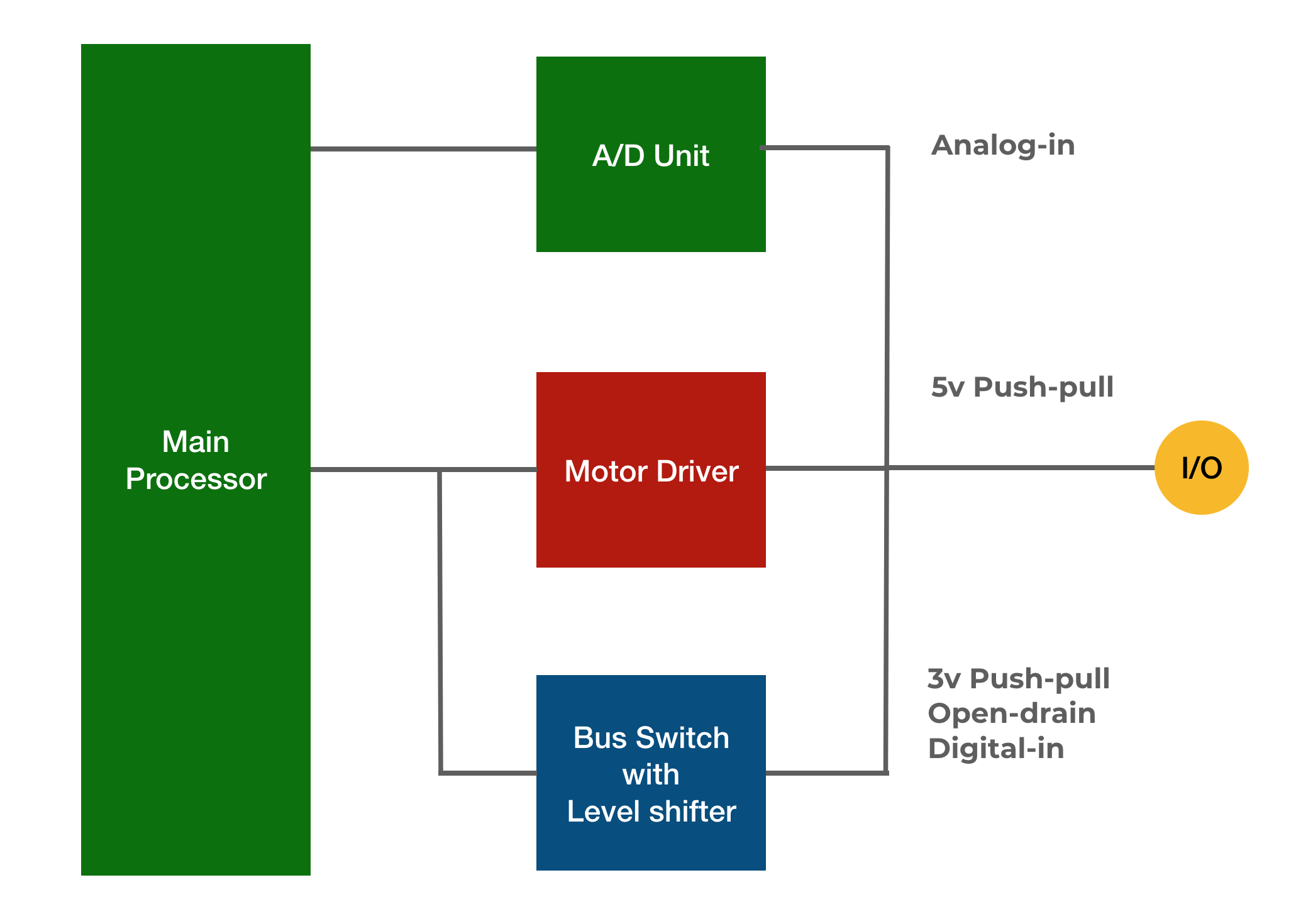 Each IO Unit is connected to A/D, MotorDriver and Bus switch.