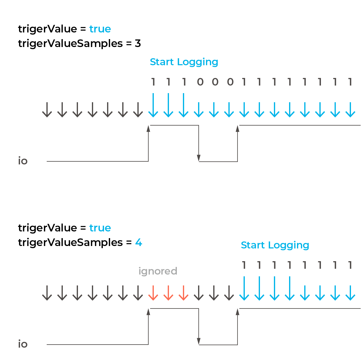 This trigger setting means "trigger when true/(or false) continues for more than X times after io change"